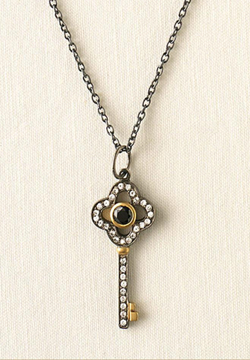 {The new Fall/Winter collection was inspired by vintage elements and you’ll notice keys in several of the designs. I simply adore this gorgeous Clover Key Necklace! Yes, please!}