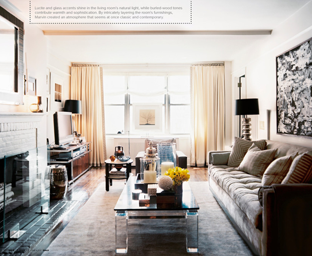 {Lucite, glass, and burlwood add a sense of luxury and light to the room. I am obsessed with the coffee table and really love the clean, modern lines of the glass fireplace screen.}ron marvin4